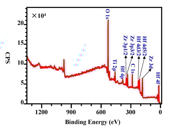 The XPS survey scan of the Ti-Zr-V-Hf film at 25 °C.