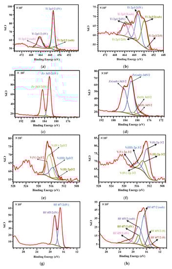 According to the XPS survey scan of the Ti-Zr-V-Hf film tested at 25 °C shown in Figure 6, it has a metal element ratio of 2.3 (Ti):2.7 (Zr):1.0 (V):1.7 (Hf). After exposure in air, the NEG films need to be reactivated after heating treatment at a certain temperature in an ultrahigh vacuum to recover the pumping ability. During the NEG film activation process, the oxygen present in the surface passivation layer is mainly diffused into the vacuum and deep inside the film. For the activation of Ti-Zr-V-Hf NEG film with OCMF substrates, it was heated at 100 °C for 2 h, and then at 150 °C for 2 h during the XPS tests. The binding energy spectra of Ti, Zr, V and Hf elements of the film sample tested at 25 °C and then at 150 °C are shown in Figure 7a–h. During NEG film activation, the Ti 2p, Zr 3d, V 2p and Hf 4f peak shifts occurred. The XPS spectra showed distinct variations when the Ti-Zr-V-Hf NEG film surface became activated after heating (see Figure 7).