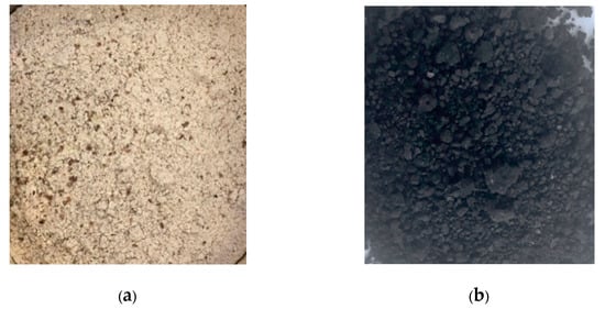 (a) Ground chestnut before pyrolysis, (b) biochar—chestnut after pyrolysis process.