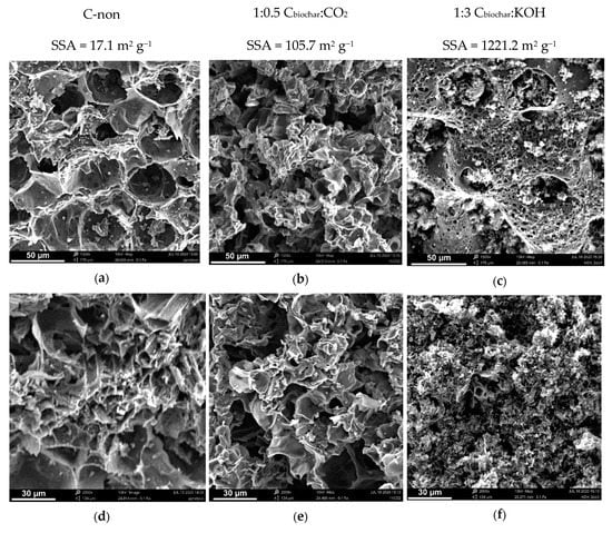 Scanning electron microscopy was used to investigate the morphology of the biochar before and after the activation process. SEM images with the corresponding specific surface area values of the samples are shown in Figure 2. The biochar sample is characterized by a small number of large pores, which results in low SSA (17.1 m2 g−1). Besides, surface contamination of raw biochar is noticed in the form of small particles on the surface being residues (e.g., ash, organic impurities such as aromatic compounds, hydrocarbons and polycyclic aromatic hydrocarbons (PAHs)) after the pyrolysis process. During the activation process, the structure of the samples and their SSA change noticeably. The physical activation with CO2 increases specific surface area to the value of 105.7 m2 g−1, which changes the structure of the sample; smaller pores appear, and the number of surface contamination particles decreases (Figure 2b,e). The chemical activation of biochar has a much more significant impact on the structure and surface area than the physical activation. Substantially more pores of smaller diameter and various depth can be observed in SEM images of KOH activated carbon (Figure 2 c,f), which results in two orders of magnitude higher SSA (1221.2 m2 g−1) compared to the pristine biochar sample. Moreover, the edges of AC particles are smoother, and the structure resembles a sponge, which is the result of the deeper penetration of the strong activating agent.