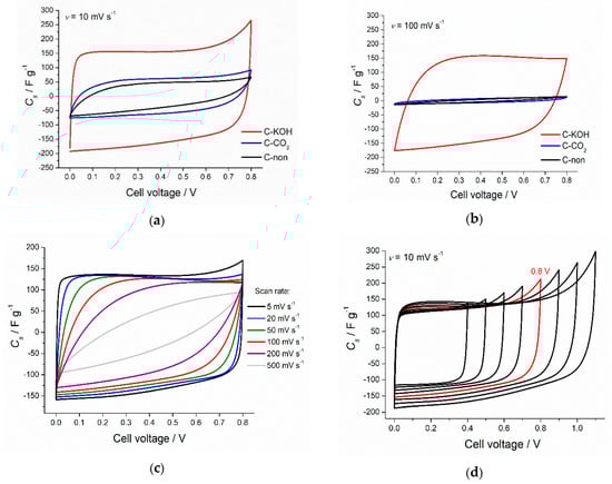 Figure 3a,b show the CV curves recorded for biochar without activation (sample marked as C-non), biochar after physical activation (C–CO2) and KOH-activated biochar (C–KOH). Activation process increases the capacitance values of the investigated carbon samples. The increase is more pronounced in the case of C–KOH sample, which is related to the exceptionally high surface area. Chemical activation of carbon materials leads to the formation of micropores, and it has been well demonstrated that the ion confinement in the micropores can lead to the higher capacitance [50,51,52,53]. The increase of the scan rate from 10 mV s−1 to 100 mV s−1 leads to the significant distortion of the CV curve shape and the essential decrease of capacitance values for C-non and C–CO2 samples. At the same time, CV curve of C–KOH preserves almost unchanged rectangular shape at 100 mV s−1, which indicates good capacitive behavior of KOH-activated carbon. This result proves that more developed porosity causes better penetration of the electrolyte through the sample.