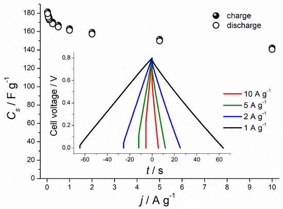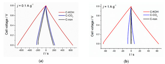 As shown in Figure 4a, galvanostatic charge-discharge profiles of all three types of carbons, recorded at a low current density of 0.1 A g−1, had triangular symmetrical distribution. The lowest specific capacitance of 57.4 F g−1 was recorded for non-activated carbon and slightly higher capacitance of 67.30 F g−1 for CO2-activated carbon (increase by 17%). Chemical activation of the chestnut-derived carbon with KOH, in turn, led to the 3-fold increase of the discharge capacitance (173 F g−1) in comparison to non-activated carbon and a 2.5-fold increase compared to the physically activated carbon. However, at higher current density (1 A g−1) (Figure 4b) only C–KOH sample preserves the triangular shape of GCD curve, proving that it has good capacitive properties for electrochemical capacitors in contrast to C–CO2 and C-non samples. The specific capacitance values of non-activated, CO2- and KOH-activated carbons, calculated from the GCD upon polarization with 1 A g−1, are equal to 2.8 F g−1, 24.5 F g−1 and 161 F g−1, respectively. C–KOH exhibits the highest specific capacitance compared to C–CO2 and C-non, which is mainly attributed to the well-developed porosity of this sample and the resulting high specific surface area. C–KOH sample, contrary to C-non and C–CO2, shows outstanding rate capability (see Figure 5 and Figure S1 in Supplementary Materials). Its specific capacitance hardly decreases with an increase of the current density, and at 10 A g−1 reaches 140 F g−1. Moreover, the IR drop (in GCD curve recorded at 1 A g−1) for C–KOH is significantly smaller (30 mV) compared to C–CO2 (245 mV) and C-non (350 mV) samples. IR drop refers to the potential induced by the resistance of the electrode/electrolyte interface. Lower IR, achieved for the KOH-activated chestnut-derived carbon, results from the microporosity introduced to the material, which creates diffusion paths for the ions, hence, lowers the resistance at the interface between electrode and electrolyte.