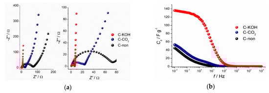 Capacitance values obtained from the impedance spectroscopy are consistent with those calculated from cyclic voltammetry and galvanostatic charge-discharge measurements. Specific capacitance values drop at high frequencies due to too short time for ions to access the whole carbon surface. In other words, part of the surface of the activated carbon, especially deep in the pores is not reached by the ions, and therefore is ionically more resistive. The capacitance dependence on the frequency presented in Figure 6b proves that the porosity of the C–KOH sample is far more developed than of the C–CO2 and C-non samples.