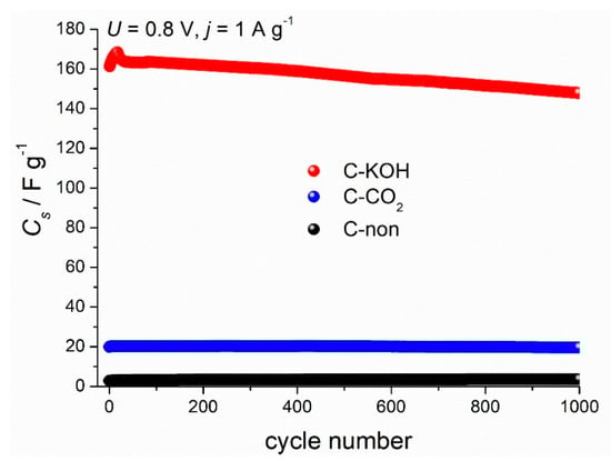 Another essential aspect for the supercapacitor performance is the cycling stability that determines the lifetime of the device. Capacitance values of three symmetric capacitors prepared from the carbon samples (C–KOH, C–CO2 and C-non) during 1000 galvanostatic charge-discharge cycles are shown in Figure 7. The capacitance of the C–KOH electrode decreases after 1000 cycles by 7.8%.