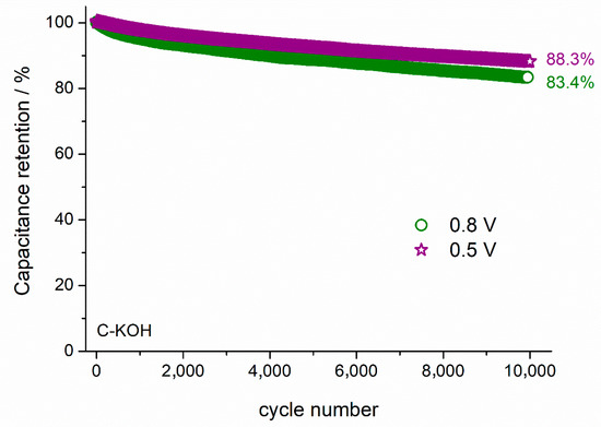 Based on the CV curves of C–KOH at 10 mV s−1 for different cell voltages (Figure 3d), 0.5 V and 0.8 V were selected for further electrochemical tests. 0–0.8 V voltage range was the maximum, where our symmetric capacitor operated without a drastic capacitance decrease upon cycling.