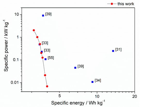 The capacitance retention of the capacitor can be improved by reducing the cell voltage. As presented in Figure 8, the capacitance retention after 10,000 cycles is equal to 83.4 and 88.3%, when the cell operates at 0.8 and 0.5 V, respectively. Specific energy (E) and specific power (P) of the symmetric electrochemical capacitor were calculated from the Equations (4) and (5), respectively: