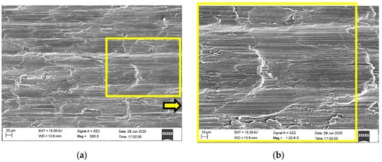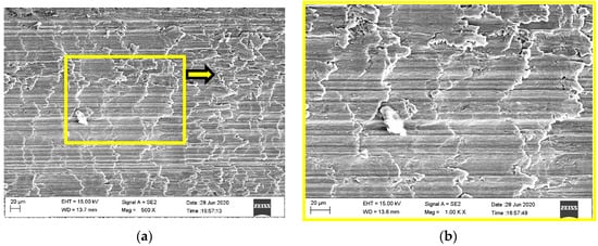 The surface microstructure and foreign elements of the dry micro cutting surface obtained with MT-HMEM and HMEM were investigated as shown in Figure 5 and Figure 6. Micro cracks could be observed on the surface machined by MT-HMEM which were related to the vibration of intermittent cutting caused by grooved micro textures on the MT-HMEM surface, but the dry micro cutting surface machined by HMEM was lacking in micro cracks, as presented in Figure 5a–d. Further, the foreign elements analysis results disclosed that the amount of O and C elements existing on the dry micro cutting surface was more than that on the surface machined with HMEM, as displayed in Figure 5f. This was due to the secondary micro cutting phenomenon generated by MT-HMEM and making more O elements from the oxidation reaction and C elements from the hard alloy MT-HMEM being deposited on the dry micro cutting surface.