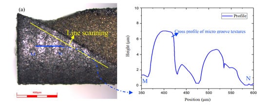 Moreover, the cross profile of MT-HMEM indicated that the micro textures incurred evident wear and tear as presented in Figure 11, and the line scanning analysis result showed that the Al and O elements could be detected on the hard alloy MT-HMEM as displayed in Figure 11b–g. Some of the Al elements came from Al 6061, due to its strong dispersal potential, and the micro grooved texture could store some debris resulting in the increase of the content of Al; the WC and Co elements of the hard alloy reacted with oxygen in the air to form an oxidation film with low hardness in the dry micro cutting process resulting in the existence of O. Thus, the tool wear mainly included rear frictional wear, oxidation wear and diffusion wear for MT-HMEM when fabricating Al 6061 material without cutting fluids.