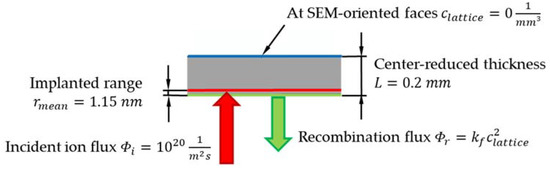 With as site fraction of lattice H, as trap site fraction and as trapping energy for the kth sort of trap. The parameters of the model can be either determined from permeation experiments [51,52] or from thermal desorption spectroscopy measurements [53,54]. The applied model for the CP1200 steel only considers one effective trap with a trap energy of 30 kJ/mol and a trap density of 5.7 × 10−7 [18]. A trapping energy of about 30 kJ/mol is representative for dislocations and some kinds of grain boundaries and it is related to rather shallow traps. The three-dimensional (3D) sample geometry was modelled making use of a quarter symmetry and it was discretised by finite elements with linear shape functions (DC3D8) and an element size of interest of 2 × 10−3−2 × 10−2 mm, resulting in a number of 13 elements alongside the flux direction. A mesh convergence study was done in order to avoid mesh dependency of the results. The applied flux boundary condition on the plasma-oriented surface in the 3D model results from the incident ion intake flux of 1020 m−2s−1 in 1.15 nm depth and on the recombination flux , with being the locally corresponding lattice hydrogen concentration. Due to narrow distance between the flux due to plasma loading and the recombination flux, the one-dimensional (1D) hydrogen permeation FE model calculated net influx is used to prescribe the hydrogen intake in the 3D model. Figure 2 depicts the boundary conditions applied to the 1D hydrogen permeation model. In fact, the boundary conditions on the SEM-oriented face of the sample was chosen corresponding to, both, the RR () and the RD () regimes, and the differences were negligible. Therefore, only the model and results of the RD case are shown in the present paper.