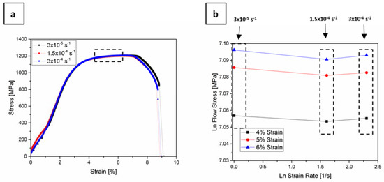 Figure 3a shows the stress–strain curves of three specimens that were tested with 3 × 10−5 s−1, 1.5 × 10−4 s−1, and 3 × 10−4 s−1. The initial part of the curve that corresponds to 3 × 10−5 s−1 strain rate does not start with zero stress, due to possible friction effects, but after approximately 1% strain, the curve exhibits a normal behaviour. There is almost no difference between the three curves; the yield stress is ~1060 MPa, the tensile strength ~1200 MPa, and strain to failure ~9%. The strain rate sensitivity of a material can be verified by the value of the strain rate sensitivity index, m, from a simple power-law relationship [55]: