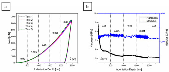 (a) Load-indentation depth plots corresponding to jump tests with 0.05 s−1, 0.005 s−1, 0.05 s−1, 0.001 s−1, and 0.05 s−1, with a change in the strain rate every 500 nm; (b) the exemplarily resulting hardness and Young’s modulus.