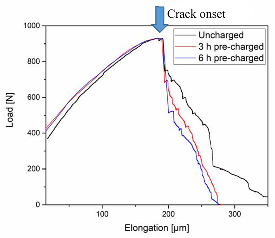 Figure 6 depicts the load-elongation curves of an uncharged sample and two charged samples with different pre-charging times, both also continuously charged during the tensile test. The first linear part of the curve is not affected by the presence of H. However, a trend can be observed in the plastic part, after the crack onset, which is indicated by an arrow. With increasing H-charging time, the elongation to failure decreased slightly, and there was a more pronounced drop in the load at ~ 200 μm, which is when cracking was initiated.