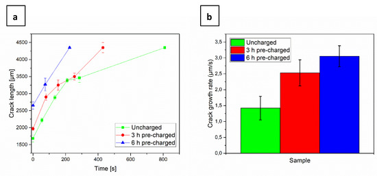 From in-situ SEM images that were recorded during the tests, the linear intercept of the crack length was estimated at different loading steps for each sample, as shown in Figure 8a. For comparison purposes, the crack initiation times were normalized to 0 s. When comparing the slopes of the curves for each sample, it can be seen that the crack propagation rate increased with charging time. Figure 8b shows a linear estimate of the crack growth rate for the three samples. While the crack growth rate for the uncharged sample was ~1.5 µm/s, the 3 h pre-charged sample exhibited a rate of 2.5 µm/s, while, for the 6 h pre-charged one, it further increased to 3 µm/s.