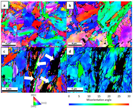The surface of samples in regions near the fracture site was analysed using EBSD. The Inverse Pole Figure maps in the normal direction are shown in Figure 9. Secondary cracks, highlighted with arrows, can only be seen in the sample with the longer charging time, Figure 9c,d. Nevertheless, while the secondary cracks seem to follow interfaces in Figure 9c, it was not possible to determine whether the cracks started at grain boundaries or inside the grains. No secondary cracks were observed in the uncharged and 3 h pre-charged samples.