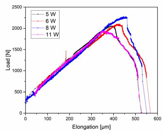 The linear loading regimes of the curves are approximately the same for all tested samples. Nevertheless, there are some differences in the maximum load (tensile strength) and elongation to failure. It was expected that the samples with higher power and, therefore, higher H concentration, would be the first ones to fail, but no clear trend was observed. Because load is plotted instead of stress due to the locally thinned sample geometry, the differences in tensile strength could be attributed to small differences in the thickness of the samples due to fabrication. Even a slight difference of ~0.02 mm in the thicknesses of the thinned area of the samples tested could lead to an error of around 5.5% and 3.5% in the maximum load and elongation to failure, respectively, which is consistent with the differences observed in Figure 10. Considering that the H concentration increases with the power (a higher power results in a higher plasma bias voltage), the sample that was tested with 11 W should have the smallest elongation to failure, while the sample with 5 W, the largest. In Figure 10 it can be seen that, even though the sample with 11 W has lower elongation to failure than the samples with 6 W and 8 W, the one with 5 W has approximately the same.