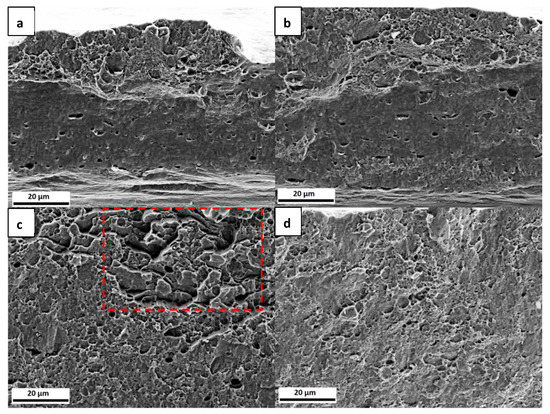 Figure 11 displays the fracture surfaces of the tested samples within the reduced thickness area. Although all of them failed in a ductile manner, they exhibited less degree of necking than the uncharged specimens and there were some differences at the microscopic level. Figure 11a,b shows a very similar morphology. While the upper part of the surfaces exhibit the presence of dimples, the lower parts show a rather smooth surface with less dimples. Figure 11c, on the other hand, shows a mixture of dimples with areas (marked with a box) that could be shear fracture or grains specially oriented. In Figure 11d, the fracture surface morphology is more uniform than the previous cases, being dominated by the presence of small dimples.