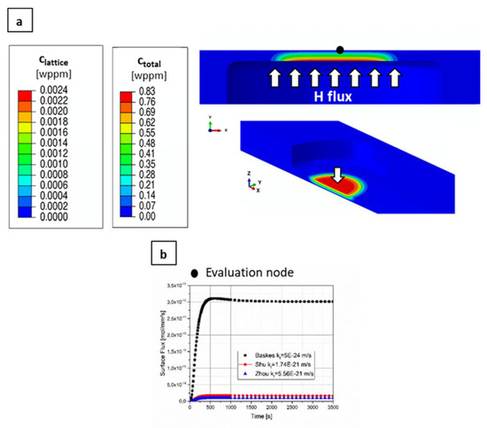 Figure 14 shows more elaborated simulation results. Here, Figure 14a depicts the cross section with two different views of the tensile samples, where the arrows indicate the direction of H charging. The concentration decreases through the thickness of the sample, resulting in 0 wppm at the top surface. The lattice concentration shows very good agreement with the analytical calculation made with ref. [46]. However, the total H concentration summing over the H stored in the interstitial lattice positions and in H traps reaches 0.82 wppm, and it is around a factor of 350 higher than the corresponding lattice H. Figure 14b shows the corresponding flux for the three sources in the evaluation node. Even though the values differ, the three cases show that a steady state is reached after approximately 500 s.