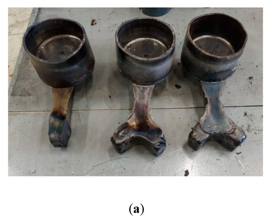 In a final trial (Trial 4) a billet of 85 mm in diameter and 61 mm in height was heated to 1380 °C–1390 °C, the soft limits were removed and the NSF press achieved 400t load. This component can be seen in Figure 10. This component showed complete filling of the arm with cup section filling to around 98.45% and with a wall thickness of 2.8 mm.