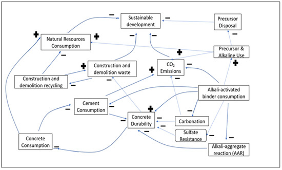 Most research on the sustainability of AAMs used Life Cycle Assessment (LCA) methodologies. For instance, [7,8] proposed a “cradle to gate” model, accounting for extraction of base minerals, transportation to production plants, and emissions released at the production stage of OPC and AAM concrete. Yet, the LCA methodology examines a fragmented sector of a complex system of systems. Since the “cradle to gate” model does not capture the environmental impact beyond the gate, the approach is only useful when comparing the production of an AAM to normal OPC.