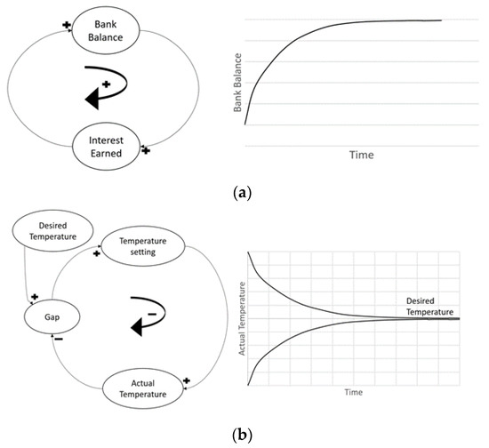 Open systems do not incorporate feedback and are usually exponential functions. The system carries out the components’ actions without prediction of further consequences. For example, there are no factors that resist bacteria population growth in a moist environment; the population is rather increasing with no awareness of the system performance. The outputs of an open system are simply characterized by its inputs. Conversely, a closed system, also known as a feedback system, is aware of its performance and modifies its components to provide optimal output. For example, a dam with automatic gate sensors measures the performance or feedback of its internal components (e.g., inflow) to control and adjust other dependent components (e.g., gate width) to achieve a goal (e.g., compensating for the outer flow). Open systems are usually consistent with the type of sign displayed. An open loop system can only contain either positive or negative signs, not the co-existence of both. Combinations of both signs are used in closed loop systems because the positive and negative feedbacks serve crucial roles in expressing a goal-seeking behavior by implementing a balance, whereas an open loop system expresses an exponential growth behavior, as observed in Figure 2. A closed system with delays in timing presents a special case called oscillation. Oscillation occurs when the system reaches its goal by over-adjusting or overshooting its components, triggering a new component to reverse its actions, causing a delay in reaching its initial goal once again (Figure 3a).