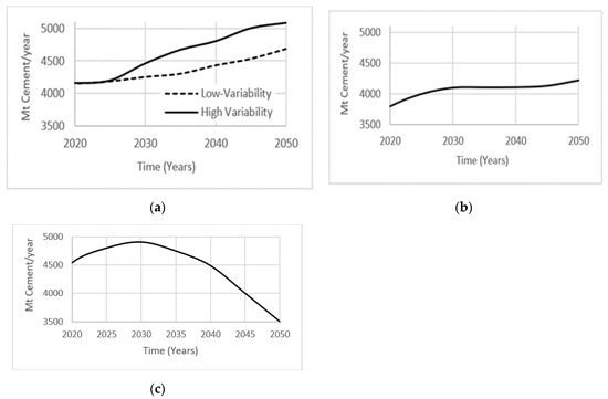 The International Energy Agency [24] projected two cases of cement consumption over the next 30 years using current patterns in gross domestic product (GDP) growth, per capita income, urbanization, growing world population, and infrastructure development needs. Depending on the assumed level of variability within the industry, cement production is expected to increase by 12–23% by the year 2050. The low variability case is implemented as a benchmark, while the high variability case is the result of sensitivity analysis performed on the production of cement demand over time in different regions (Figure 4a). Ruijven et al. [25] projected cement consumption assuming a 4% increase in carbon tax per year for the next 30 years. They predicted stabilization in cement consumption by the year 2050, as industries will defer away from manufacturing CO2 emission intensive products (Figure 4b). Farfan et al. [26] examined an alternate view of projected cement consumption, with closing gaps in the world’s GDP growth and infrastructure development needs. An increase in the development of African, Asian, and Latin American countries will result in a peak of global cement production around year 2030, followed by a decrease until year 2050 (Figure 4c). These diverse projected cement demand scenarios will be tested in the system dynamics model proposed in the present study.