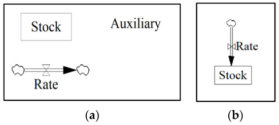 (a) Basic building blocks of System Dynamic modelling; and (b) rate flowing into a stock.