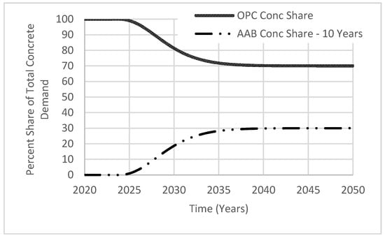 In addition to flexibility in adjusting the targeted AAB market share, the policy implementation period can also be varied with 5-year increments using the variable called “achievtime AAB”. A 10–20-year range was selected considering the simulation period (year 2020 to 2050). Once most concrete manufacturers adopt AABs, growth of its market share, “AAB Conc Share”, will resemble the shape of the letter S (Figure 8). S-shaped growth indicates the targeted goal being achieved by increased interest in AAB for enhancing concrete durability and reducing CO2 emissions. While the use of AAB continues to grow, the market share of OPC, “OPC Conc Share”, will continue to decline in an inverted S-shape. From the figure shown, both variables are proportional to each other as the percentage of “OPC Conc share” is calculated by subtracting the percentage of “AAB Conc Share” from 100%. The stabilization of the market share demand indicates a stabilization of future investments, as markets would reach a limit in providing materials at reasonable prices.