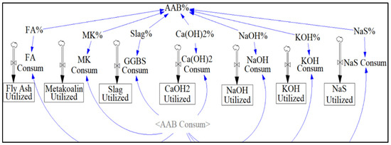 The sector “AAB consumption” allows the user to observe the effect of AAB mixture proportion on net emissions (Figure 10). Since the Vensim model allows changing of the activator and precursor content using the sliding input device, a range of 50–80% of precursor and 20–50% of activator can be simulated using a slider feature built into the model.