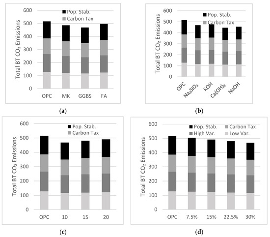 Sensitivity analysis exhibiting the effect of the (a) precursor type; (b) activator type; (c) policy implementation period; (d) AAB target market share demand in a Low Variability Scenario, High Variability Scenario, Carbon Tax Increase Scenario, Population Stabilization Scenario in the year 2050.
