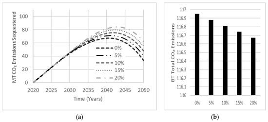 Cases for the influence of AAB market share were tested with the policy implementation period fixed at 10 years and the same AAB mixture used for analyzing the effect of the policy implementation period. As the AAB market share increased, net emissions decreased (Figure 11d). Market shares of 7.5% and 30% reduced net emissions by 3%, and 8%, respectively. The use of AAB increased exponentially as per an open loop system where AAB production can spark further interest, causing more production of AAB.