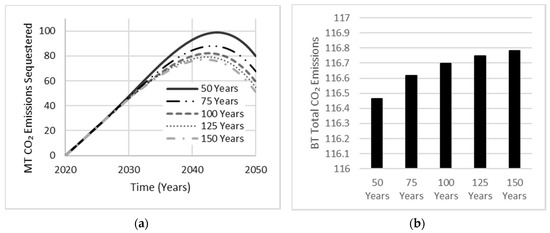 As the AAB market share escalates to 30%, the annual production of OPC concrete will eventually stabilize, reaching a target goal of 70% market share. Hence, a depreciation in the amount of OPC concrete correlates to a depreciation in the total amount of CO2 emissions being sequestered, with OPC concrete sharing a larger portfolio with an assumed service life of 45 years by Nehdi et al. [12]. As the service life of AAB increased, the total amount of CO2 emissions sequestered decreased (Figure 13). Since this relationship suggests a more conservative approach in approximating the total amount of CO2 emissions released, an assumed service life of 90 years shall be used in all AAB cases. Although carbonation is known to decrease the durability of concrete structures via corrosion of steel reinforcement, leading to decreased service life, AABs have continuously demonstrated superior engineering characteristics when examining mechanical strength, thermal and durability properties of concrete [28].