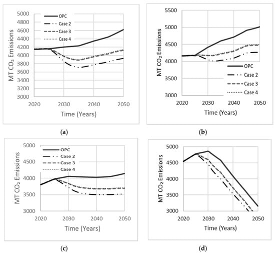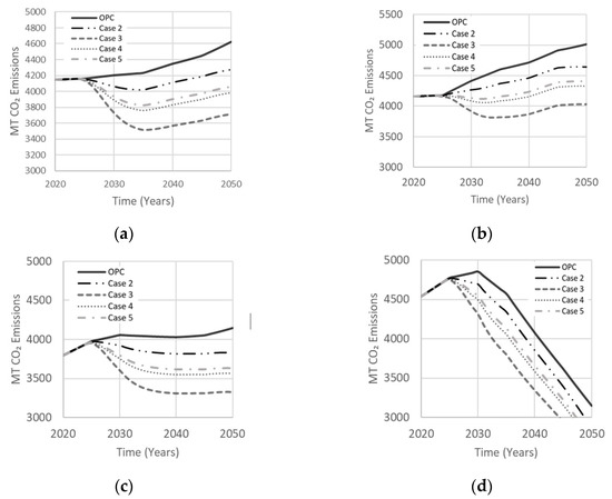 The composition of AAB can vary by proportioning the activator to precursor ratio to achieve optimal mechanical strength and durability. Since MK needs a relatively larger amount of alkali-activator due to its low Si:Al ratio, the MK dosage is usually 55–65%. The dosage of GGBS and FA is in the 70–80% range (Table 1). Each simulation case involves a single precursor with varying activator dosage, comprised of either Na2SiO3 or NaOH. Case 1 is a base scenario in which OPC occupies 100% of the total market. Case 2 was derived by Bernal et al. [29] using GGBS with Na2SiO3, which proved to achieve a higher mechanical strength of approximately 75 MPa with a 90-day curing period. Kim et al. [15] used LCA to model the CO2 emissions released by the AAB mixture examined in case 3. Fernandez-Jimenez et al. [30] reported an optimal compressive strength of 70 MPa for an AAB concrete made with FA precursor and NaOH as an activator, deriving the composition of case 4. Simulation results for these four cases are shown in Figure 14. The drop in net emissions observed in all cases at about ten years into the simulation period indicates increasing interest in AABs concrete, which started to gain market share. Case 2 produced least net emissions (16% reduction). Cases 3 and 4 reduced net emissions by comparable amounts but were less effective than case 2.