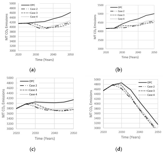 Effect of idealistic AAB cases on net emissions released in (a) Low Variability Scenario; (b) High Variability Scenario; (c) Carbon Tax Increase Scenario; (d) Population Stabilization Scenario.