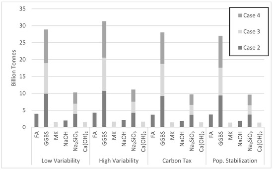 Case 3 requires large consumption of MK. Yet, Figure 18 points to issues with the projected MK consumption. The MK consumption in the high variability cement demand scenario by the year 2050 largely exceeds current production. Noting that metakaolin is used by various industry sectors, investments are needed to increase MK production over the next few decades. For instance, the state of Georgia in the USA has an estimated 10 billion tons of kaolinite clay, while Brazil has a deposit of 2 billion tons. Clearly, different viable scenarios of AAB production will emerge in different major cement producing countries depending on the available resources and local context. The largest amount of precursor used over the simulation period is GGBS at 10.74 billion tons in cases 2 and 4 for the high variability demand scenario (Figure 19). Although case 4 uses more GGBS than case 2, the amount of GGBS consumed in both cases was similar because of the 7.5% lower market share for case 2 (Figure 19). The largest amount of activator needed over the simulation period is Na2SiO3 at 4.3 billion tons in case 2. Na2SiO3 production seems to be a barrier for AABs, as pointed out earlier.