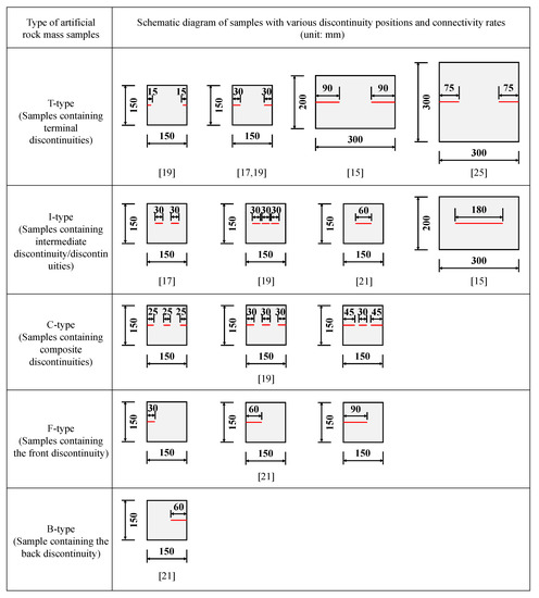 | Sample Type | Connectivity Rate | Quality Ratio of Materials | Cohesion of the Rock Bridge (MPa) | Angle of the Internal Friction of the Rock Bridge (°) | Cohesion of the Discontinuity (MPa) | Angle of the Internal Friction of the Discontinuity (°) | Reference |