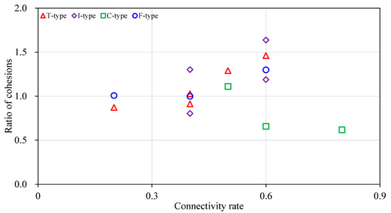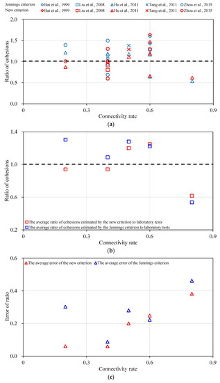 | Sample Type | Connectivity Rate | Test Result of the Cohesion c (MPa) | Estimated Cohesion by the Jennings Criterion c1 (MPa) | Ratio of c1 to c Rc1 | Estimated Cohesion by the New Criterion c2 (MPa) | Ratio of c2 to c Rc2 | Reference |