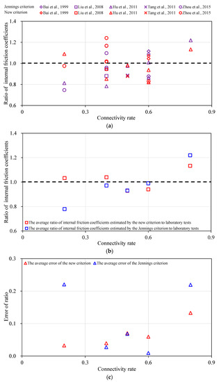 | Sample Type | Connectivity Rate | Test Result of the Internal Friction Coefficient tanφ | Estimated Internal Friction Coefficient by the Jennings Criterion tanφ1 | Ratio of tanφ1 to tanφ Rf1 | Estimated Internal Friction Coefficient by the New Criterion tanφ2 | Ratio of tanφ2 to tanφ Rf2 | Reference |