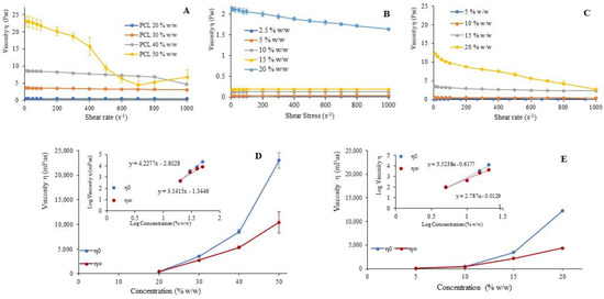 For each concentration analyzed a shear stress (τ) versus shear rate (s−1) plot was processed to extrapolate zero shear viscosity (η0) and infinite shear viscosity (η∞) values. These values were plotted against % w/w polymer concentration; after log–log transformation of the values on the axes, the CEC was determined as the intersection point of the two straight lines [33].