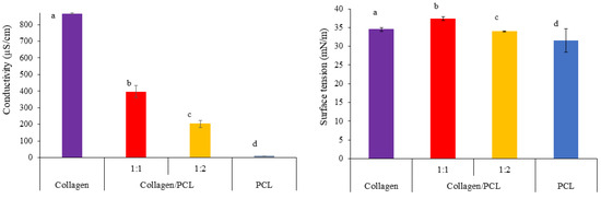 Conductivity (µS/cm) (on the left) and surface tension (mN/m) (on the right) values of collagen, collagen/PCL 1:1 and 1:2 (w/w) and PCL solutions prepared at total 20% (w/w) concentration. ANOVA 1 way—MRT (p < 0.05) (mean values ± s.d.; n = 5) for conductivity: a vs. b, a vs. c, a vs. d, b vs. c, b vs. d, c vs. d. ANOVA 1 way—MRT (p < 0.05) (mean values ± s.d.; n = 5) for surface tension: Not significant.