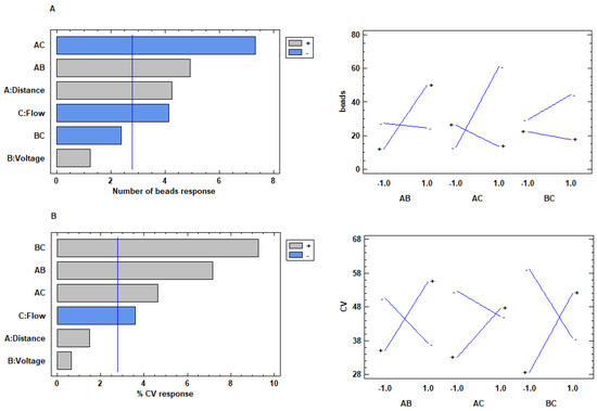 Effects of the considered process parameters (on the left) and interaction plots (on the right) for (A) “Number of beads” response for 1:1 (w/w) collagen/PCL fibers and (B) “Coefficient of variation (% CV)” response for collagen/PCL 1:2 (w/w) fibers.