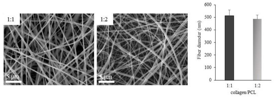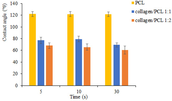 Figure 9 shows the results of wettability analyses for PCL and collagen/PCL (1:1 and 1:2 w/w) electrospun nanofibers. As expected, in accordance with the literature, the addition of collagen in the nanofibers involved a substantial reduction of the contact angle values compared to the nanofibrous membranes obtained with PCL only. The wettability increased thanks to the presence of the hydrophilic protein which reduced the interfacial tension between the water and the solid surface of the nanofibers. Quite close results characterize the two samples with lower and higher amount of collagen.
