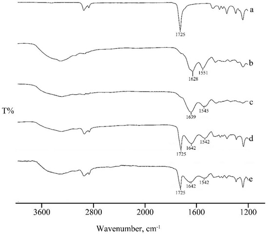 FTIR spectra of PCL (a), native collagen freeze dried (b) and nanofibers (NFs) based on collagen (c), collagen/PCL 1:1 (d) and 1:2 (e) (w/w).
