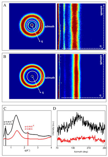 The azimuthal profiles (Figure 7D) were fitted by a Gaussian function to evaluate the Full-Width-at Half-Maximum (FWHM). The results (Table 4) showed a higher extent of crystalline domain (smaller FWHM) in the native collagen (Figure 7D, black profile), than in the acidic one (Figure 7D, red profile).