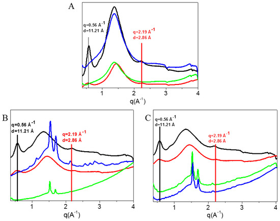Furthermore, the evaluation of the effect of the electrospinning process on the protein structure stability was performed by comparing the diffraction profiles of collagen in 90% (v/v) acetic acid aqueous solution before and after the electrospinning process (Figure 8A). Collagen based electrospun membranes with different weights were characterized (Figure 8A (green profile) 15 mg, 8A (blue profile) 55 mg). In both profiles, the meridional and the equatorial reflections almost disappeared after electrospinning process, thus, the triple helix structure is no longer visible. Moreover, a further decrease in molecular lateral packing, stronger that already observed after acidic treatment, occurs. Figure 8B,C show the effect of blending with PCL, in solution and after electrospinning, respectively. The profiles of native collagen and of collagen in acetic acid are repeated for comparison purposes. Figure 8B shows that the integrity of the triple helix structure of collagen is already lost when collagen is blended with polycaprolactone in 90% (v/v) acetic acid aqueous solution at both different weight ratios (Figure 8B (green profile) 1:2 w/w, 8B (blue profile) 1:1 w/w). In both mixtures, the meridional and equatorial reflections are not identified, indicating the substantial denaturation of the protein. Figure 8C confirms that after electrospinning process, in both membranes (Figure 8C (green profile) 1:2 w/w, 8C (blue profile) 1:1 w/w) the meridional and the equatorial reflections were absent. The additional peaks shown in the nanofibrous membranes, near the meridional reflection region, were typical of the PCL.