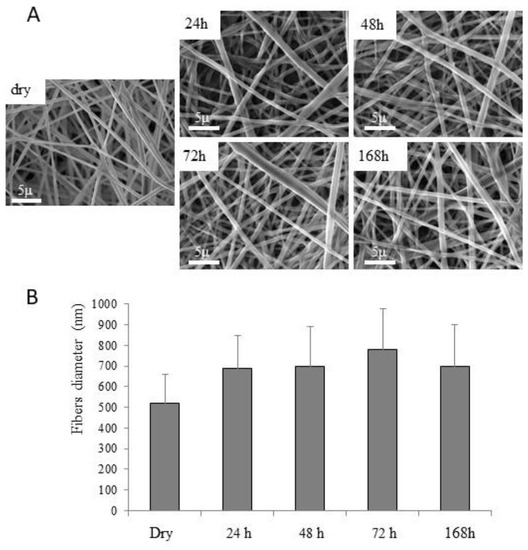 Photomicrographs SEM (A) of 1:1 weight ratio collagen/PCL nanofibers in dry and hydrated states from 24 h up to 1 week (168 h) at room temperature, and size diameters comparison (B) (mean values ± s.d., n = 60).