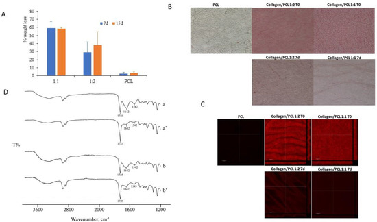 Collagen release from the nanofibrous membranes. (A) Weight loss (%) after 7 and 15 days in PBS. (B) collagen staining with eosin, optical microscope images, at time 0 and after 7 days in PBS. (C) collagen staining with eosin, CLSM images, at time 0 and after 7 days in PBS. (D) FTIR spectra at time 0 (a: collagen/PCL 1:1, b: collagen/PCL 1:2) and after 7 days in PBS (a’: collagen/PCL 1:1, b’: collagen/PCL 1:2).