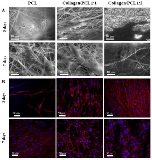 Fibroblasts growth and adhesion on nanofibers after 3 and 7 days culture. (A) SEM photomicrographs (B) confocal laser scanning microscopy (CLSM) images (nuclei blue marked with Hoechst, cytoskeleton red marked with Phalloidin-TRITC).