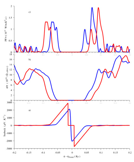 The Engel–Vosko functional and Tran-Blaha modified Becke-Johnson (TB-mBJ) potential can both result in an enlarged band gap that is 1.76 eV for the former and 1.88 eV for the latter [26,58]. In any case, the GGA and LDA calculations are expected to underestimate the gaps [59]. In order to investigate the influence of the band gap on the thermoelectric properties, we performed the thermoelectric properties calculations by using both 1.3 eV and 1.88 eV as band gap energies, the latter one being obtained with the help of a scissor operator. The shapes of the evolution are similar, however, the maximum values of the Seebeck coefficient are different (Figure 3). In agreement with the results calculated with the TB-mBJ approximation [26], the Seebeck coefficient has maximum values of around ±3000 μV/K near the Fermi level at 300 K when the gap is 1.88 eV, even if, in the present work, we used a denser mesh in the Brillouin zone (3000 vs. 2000 k-points). It can be concluded that the band gap does not influence the thermoelectric properties evolution vs. chemical potential. Only the maximum values of Seebeck coefficient calculated from Boltzmann theory are affected. The underestimation of the band gap results in an underestimation of the Seebeck coefficient that can be corrected by applying a scissor operator.