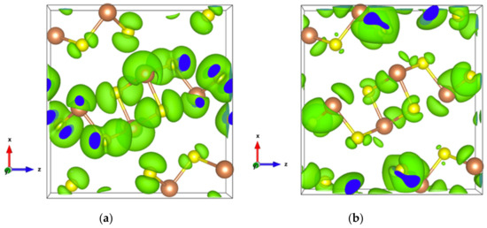 Electronic density of SbS2. (a) In the energy range comprising the top two valence orbitals with an isosurface of 0.004 electrons/bohr3; (b) For the single bottom conduction orbital with an isosurface of 0.003 electrons/bohr3.