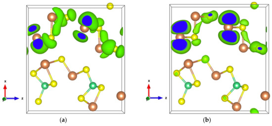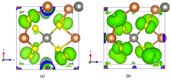 (a) Electronic density of Sb2S3Be2 for the highest occupied orbital with an isosurface of 0.001 electrons/bohr3; (b) Electronic density of Sb2S3Be2 in the energy range comprising the top two valence orbitals with an isosurface of 0.003 electrons/bohr3.